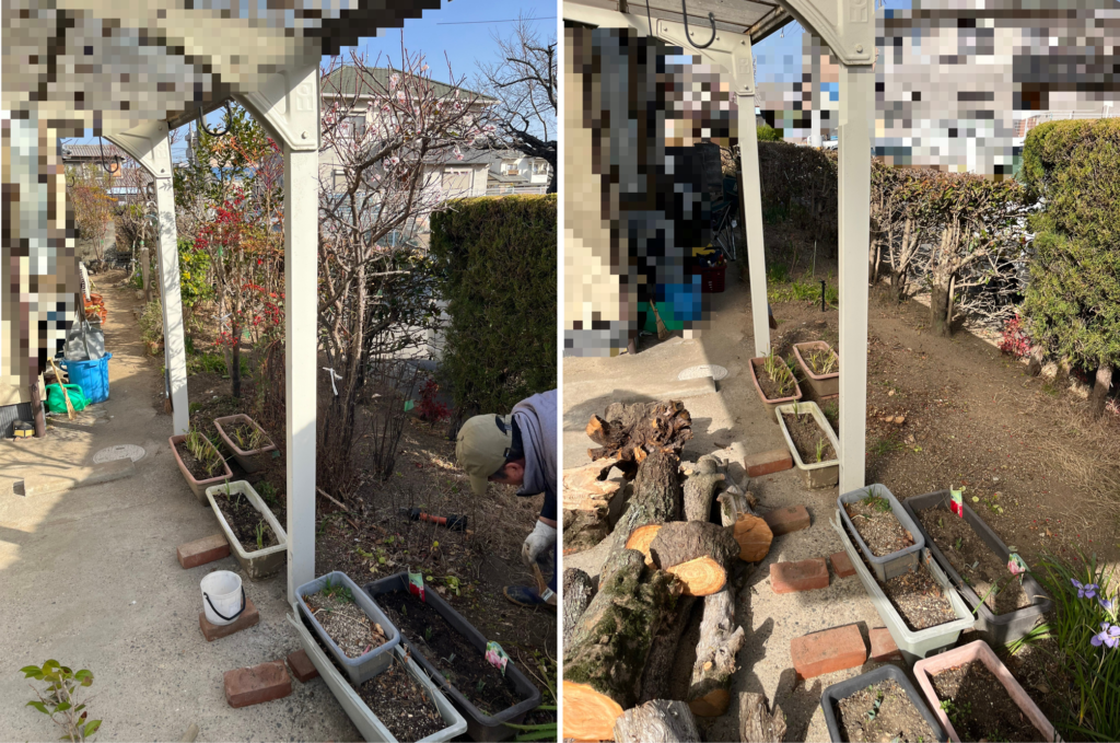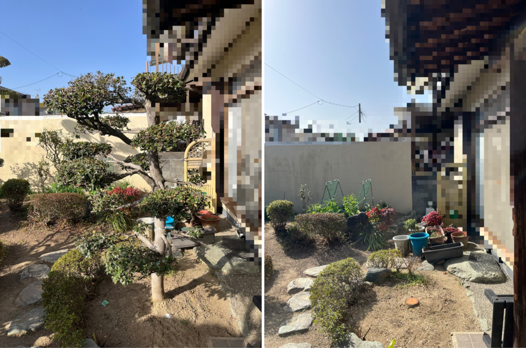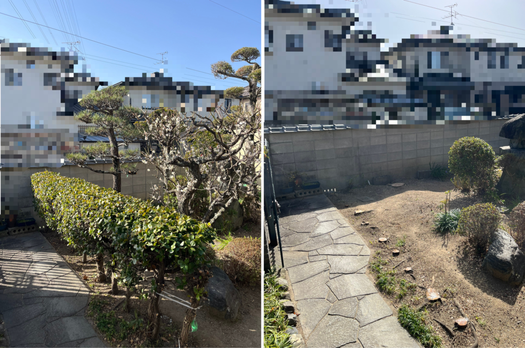 こちらの現場は、今後マキの木の根が配管などに支障をきたす恐れがある為、伐採をご依頼いただきました。その他も維持管理が大変とのことで、減らさせていただきました。