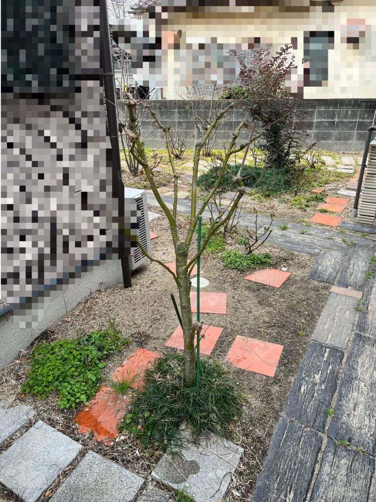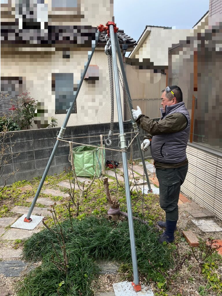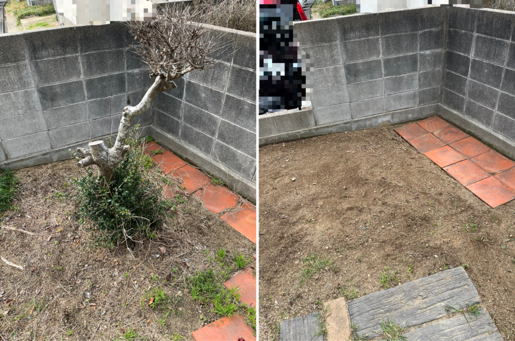 倉敷市中庄にて、もみじ、トキワマンサク、ツゲの伐採、抜根を行いました。
