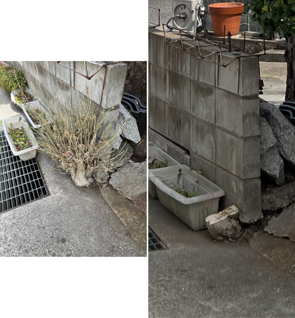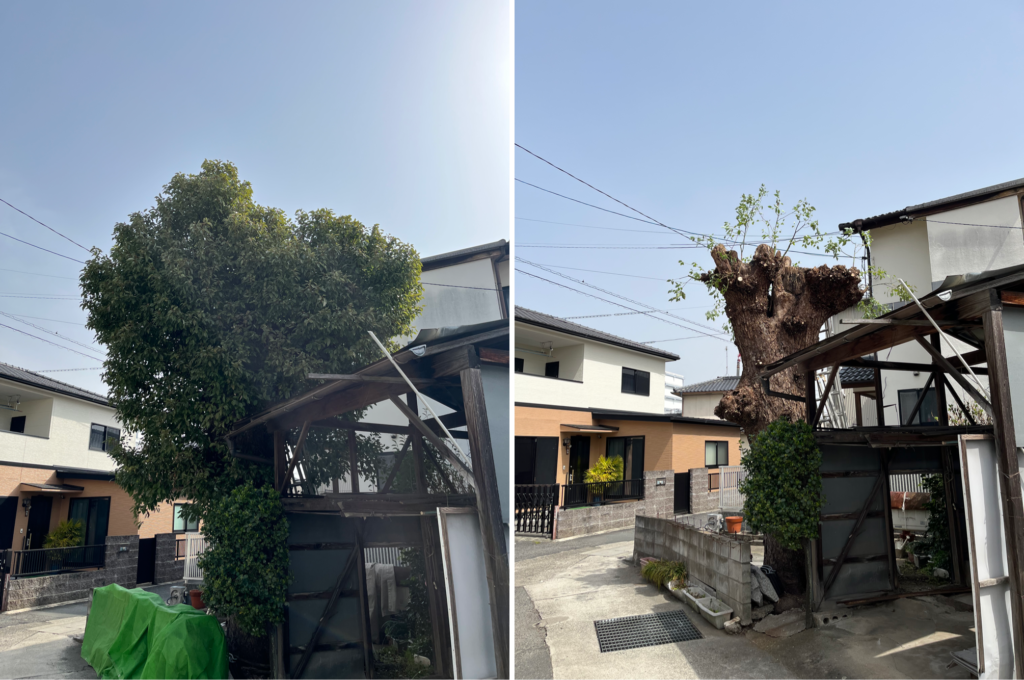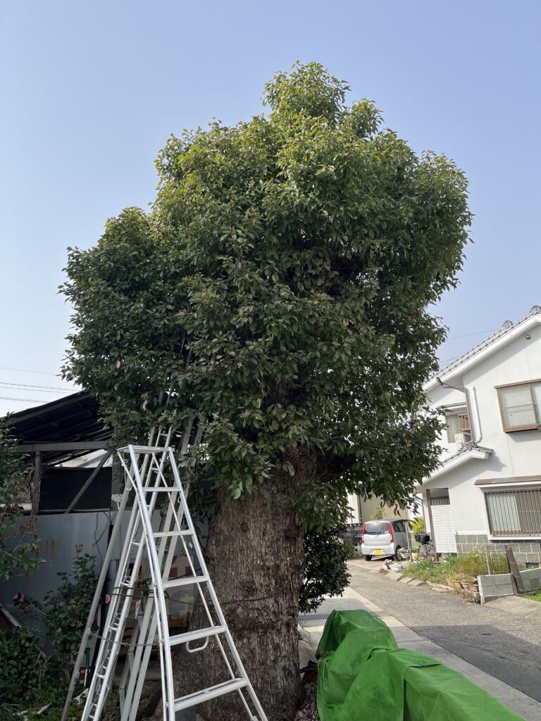 今回は、総社市総社にて楠木の剪定、ブロック塀に生えている木の処理、ネズミモチの伐採を行いました。