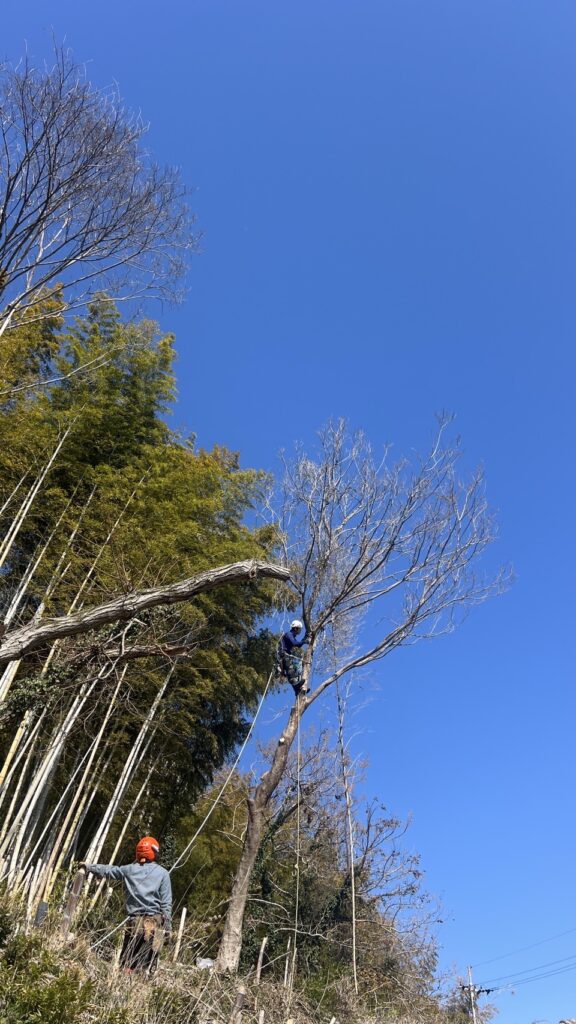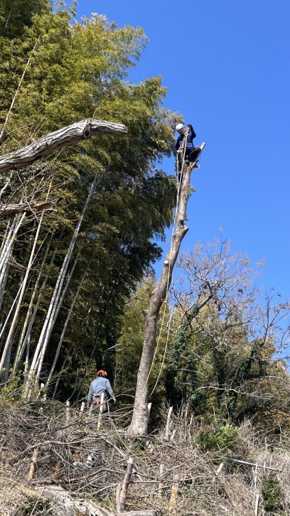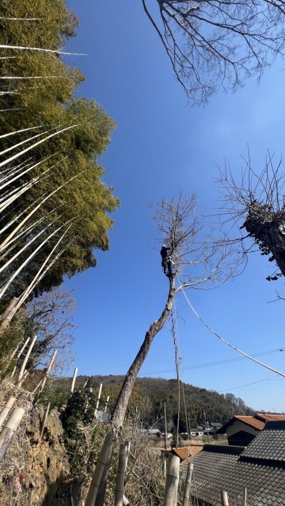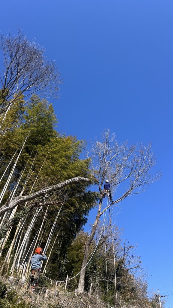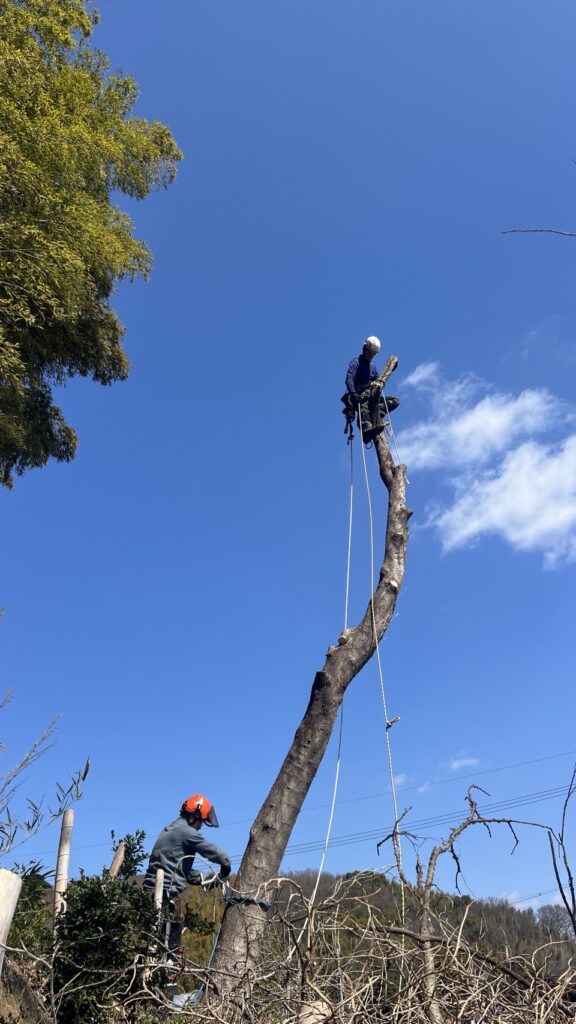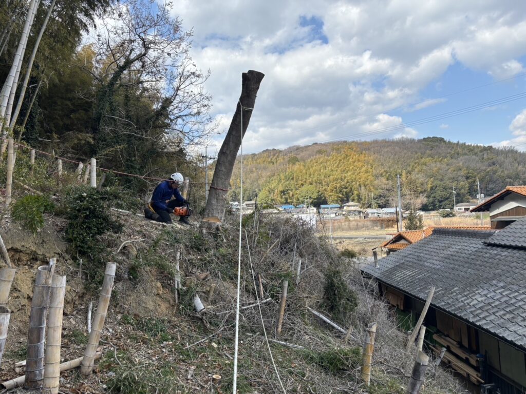 そのため、ロープを使った吊り切りなどの特殊伐採を実施し、安全を最優先に進めました。